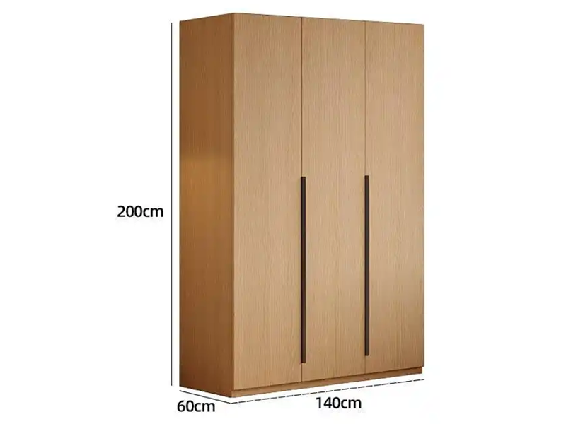 This three-door wardrobe, featuring a light wood finish and dark metal handles, offers spacious storage with dimensions of H200cm × W140cm × D60cm. Designed for modern bedrooms, it combines sleek aesthetics with functional organization, ideal for maximizing closet space.